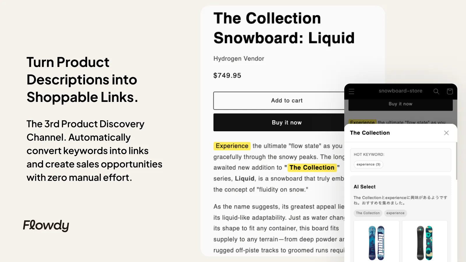 - Flowdy uses AI to automatically highlight keywords in blogs and descriptions, converting content into shoppable links.