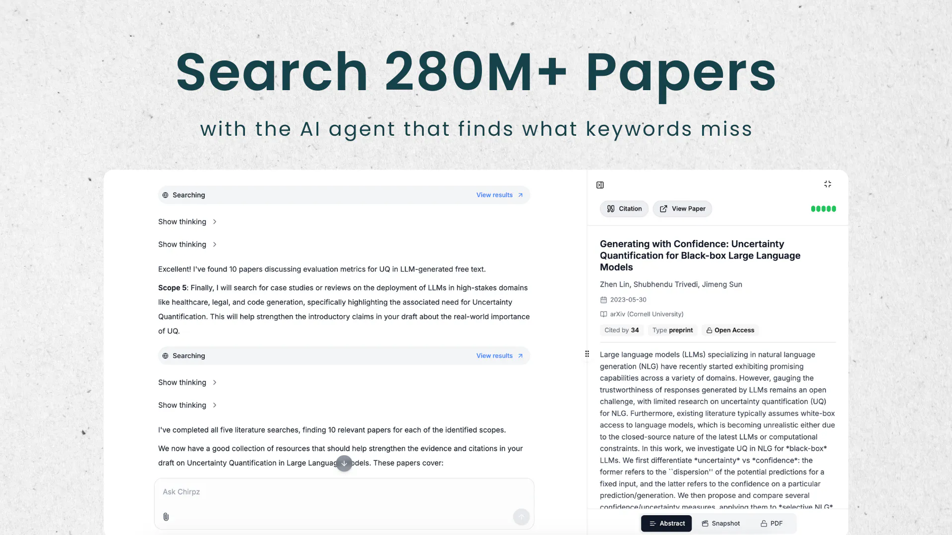 - Chirpz Agent enables discovery of unseen literature through context-aware search across 280M+ papers in major academic databases.