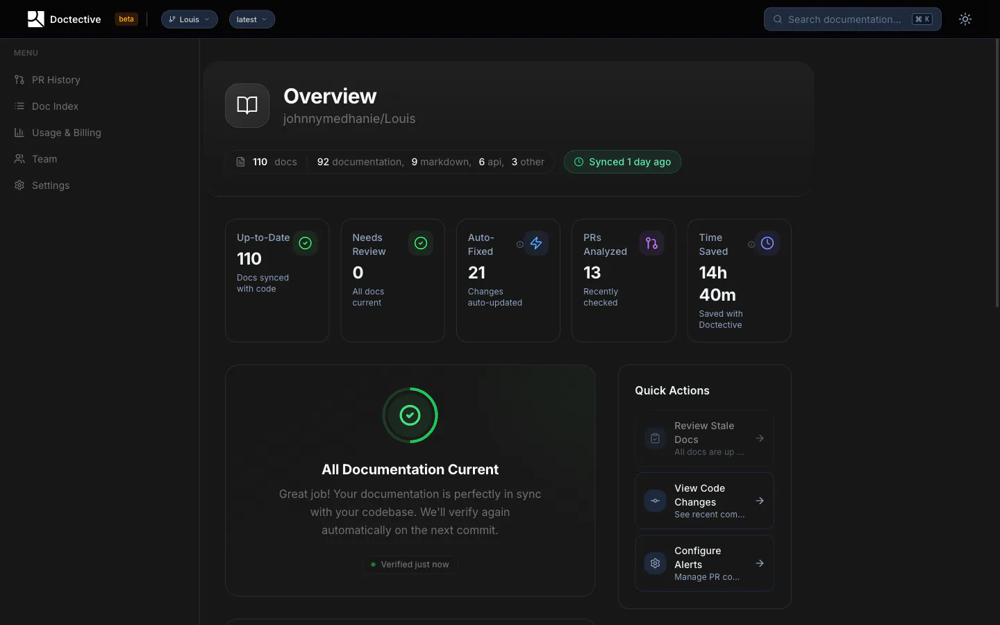 Doctective is an innovative solution designed to eliminate the hassle of manual documentation updates. Its tagline, "Stop Updating Documentation. We Do It Accurately For You," captures its core mission: to automatically keep all your documentation fresh and accurate by syncing directly with your code. With a simple one-time installation, Doctective ensures your documentation is always up-to-date, eliminating the common problem of stale or outdated materials. This app streamlines the documentation process, saving time and effort while maintaining precision, making it an essential tool for developers and teams seeking reliable, auto-updating documentation.