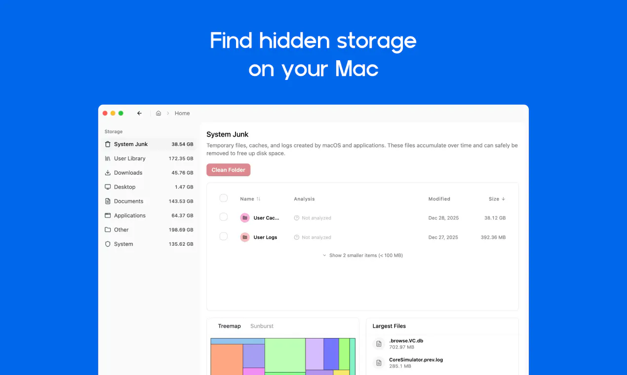 - It locates cache, junks, and logs that consume storage space.