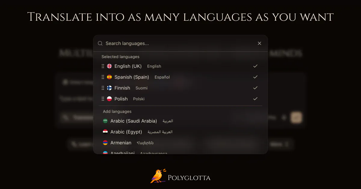 - Polyglotta is a multilingual translator AI agent designed for translating multiple languages simultaneously.