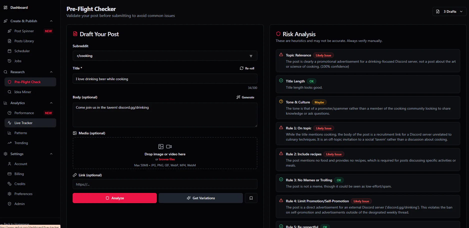- The platform enables posting at optimal times per subreddit and helps avoid spam patterns and risky behavior.