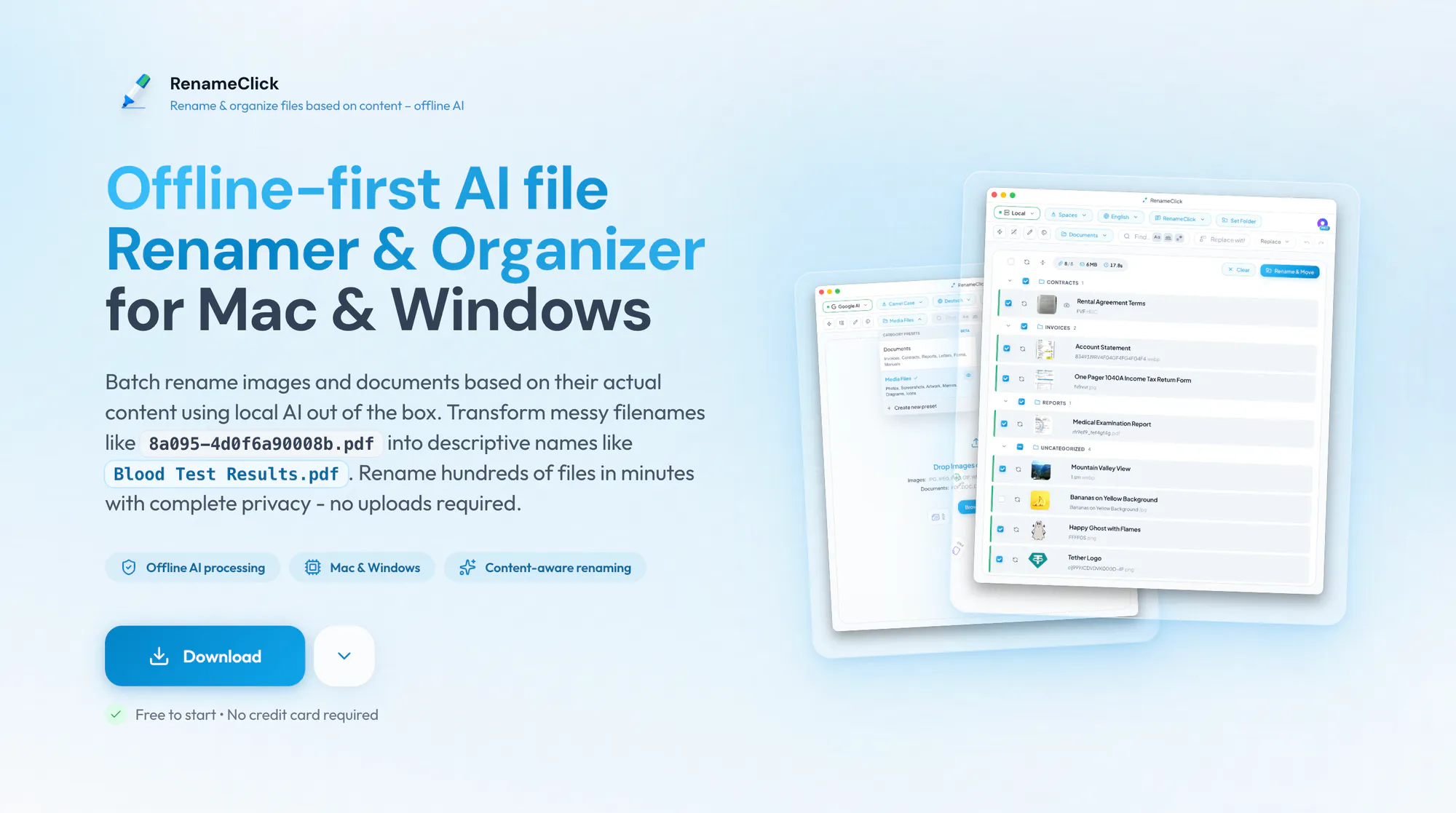 - Offline-first AI file renamer and organizer for Mac/Windows, analyzing content locally without uploads.