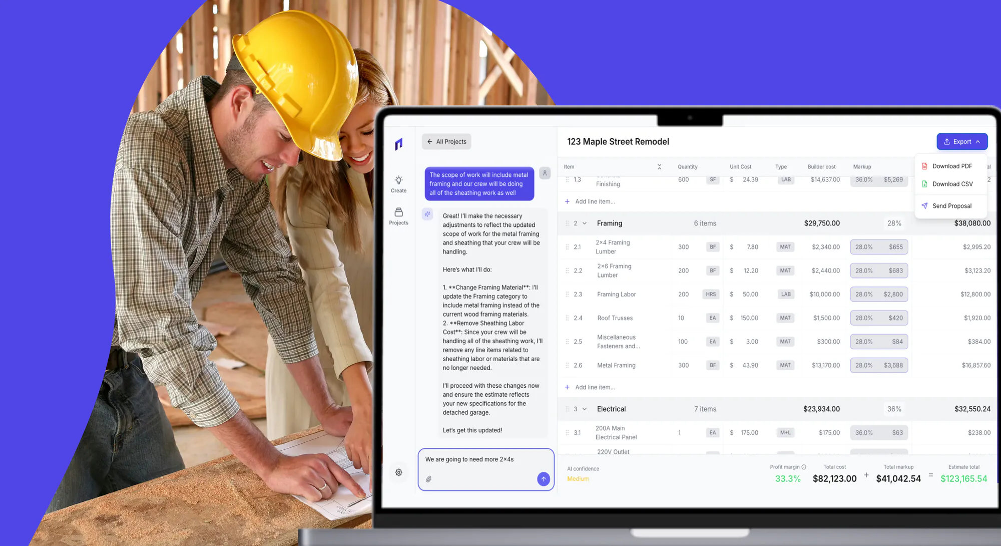 - Contractors can review, customize, price, and turn takeoffs into professional proposals instead of manual estimation from scratch.