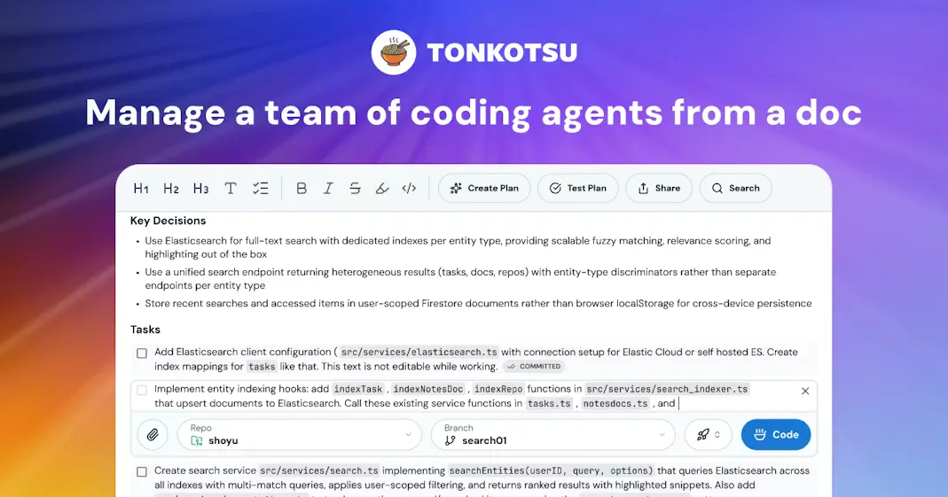- Tonkotsu provides a clean and focused GUI for managing a team of coding agents.