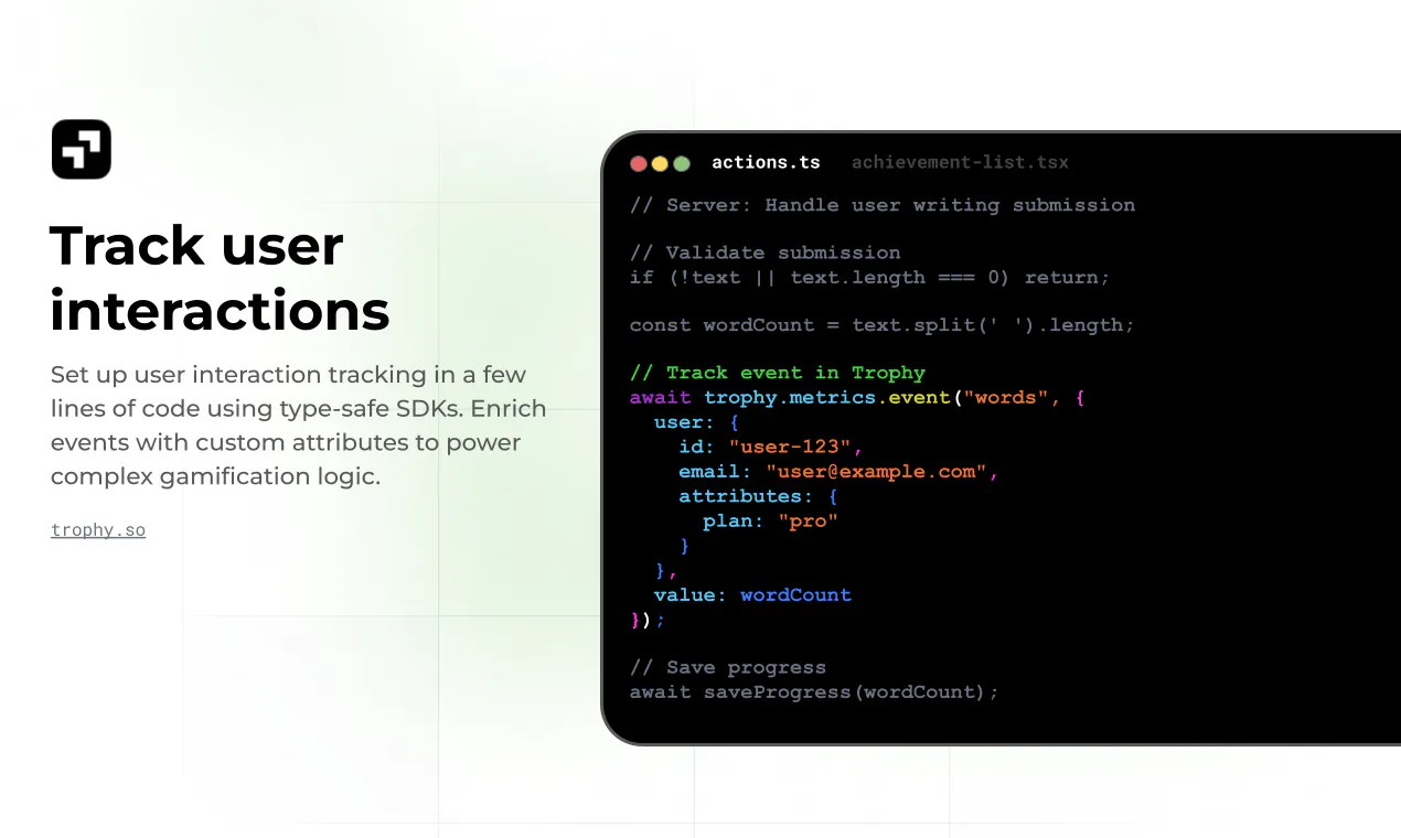 Trophy 1.0 is a gamification API platform that enables developers to quickly integrate key game-like elements into their applications. It offers flexible APIs for achievements, streaks, XP, badges, ranks, and leaderboards, allowing for fast implementation of gamification features without extensive coding. The platform includes no-code configuration tools, automated personalized email and push notifications, and a dashboard to monitor retention and engagement impact. By streamlining the gamification process, Trophy 1.0 helps developers enhance user engagement and retention efficiently, making it easy to deploy and manage gamified experiences in various applications.