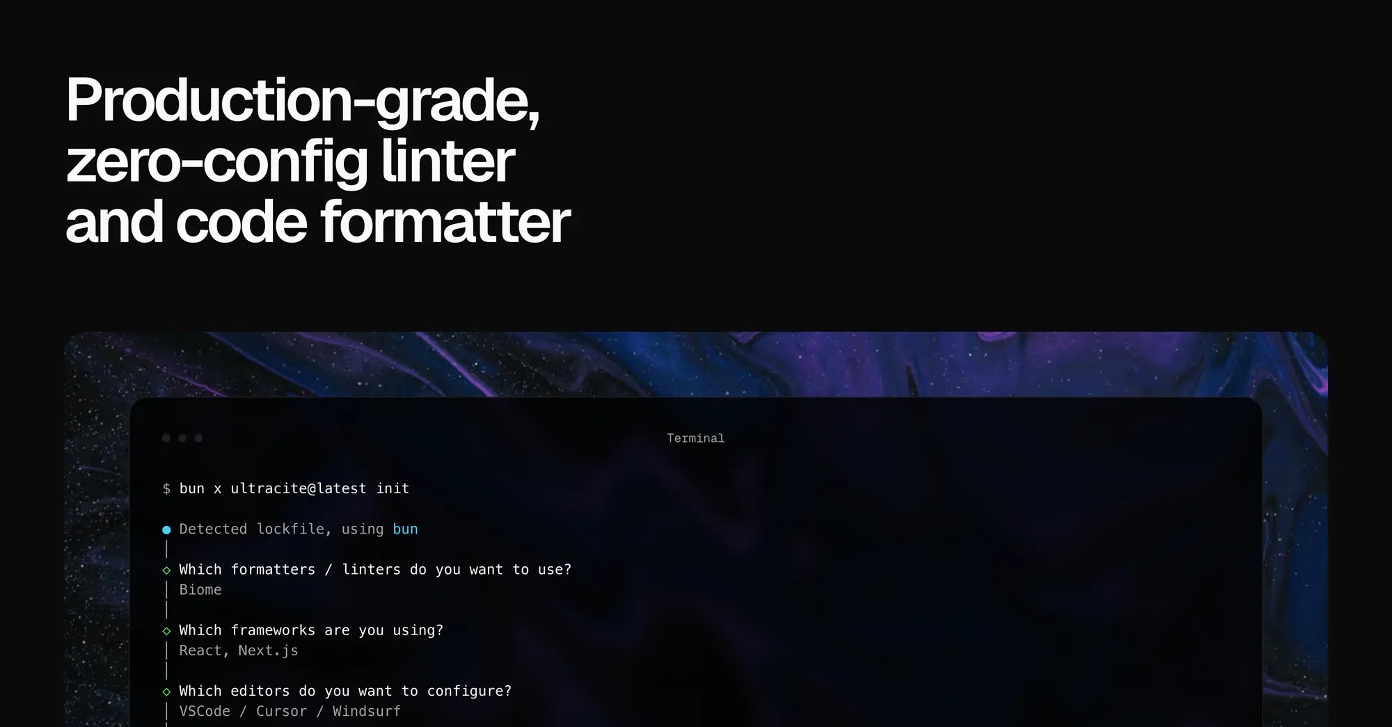 - Ultracite v7 is an opinionated, zero-config code linter and formatter.