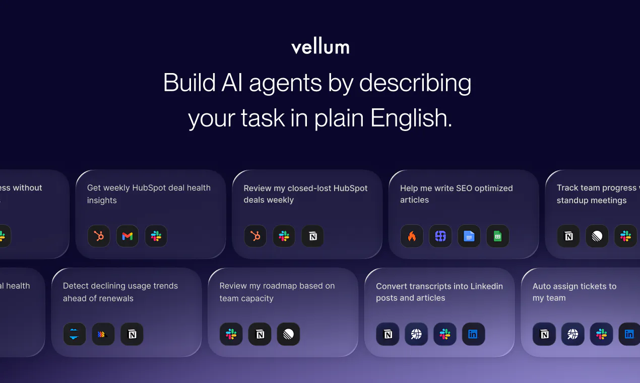 - Vellum allows building AI agents by describing tasks in plain English without coding.
